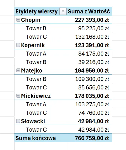 Wyjściowa tabela przestawna może wyglądać następująco: