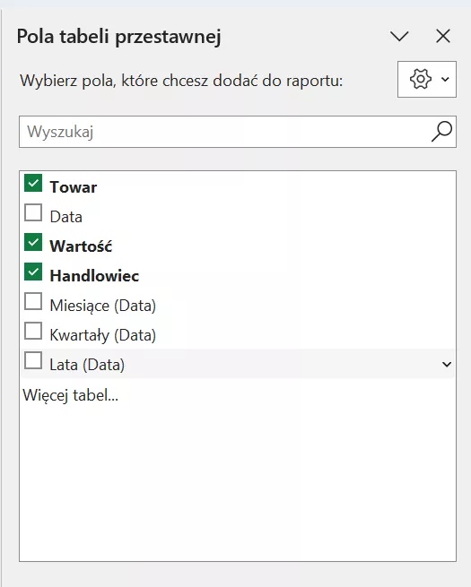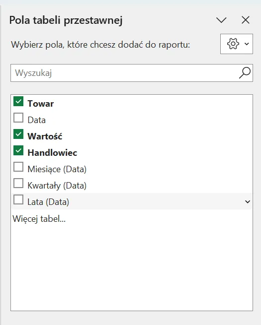 Załóżmy dalej, że tą tabelę przestawną chcemy przefiltrować wg miesięcy, w których nastąpiło zamówienie. W pierwszej kolejności musimy mieć na liście pól tabeli przestawnej pole Miesiące. Aby tak się stało, wystarczy, że dodasz np. do obszaru wierszy pole Data. Wtedy daty automatycznie zgrupują się w lata, kwartały i miesiące i na liście pól tabeli przestawnej będzie to wyglądać następująco: