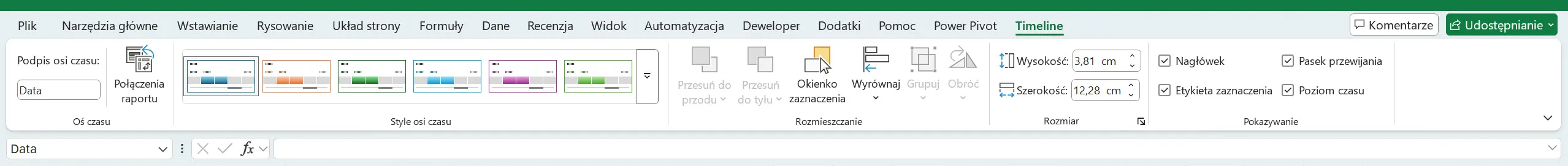 Jeżeli chcesz zmodyfikować swoją oś czasu (czyli np. zmienić jej kolorystykę), to mając ją zaznaczoną możesz wejść na wstążce na kartę Timeline (w starszych wersjach Excela nazywała się ta karta Opcje):