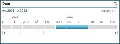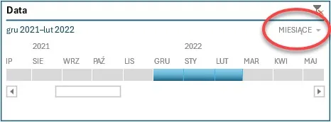 będzie pokazywać dane dla transakcji od grudnia 2021 roku do lutego 2022 roku włącznie. Ważne jest to, że przy wybieraniu wartości na osi czasu, musimy trzymać się jednego przedziału. Co oznacza, że nie dasz rady zaznaczyć np. po jednym miesiącu w dwóch różnych latach.