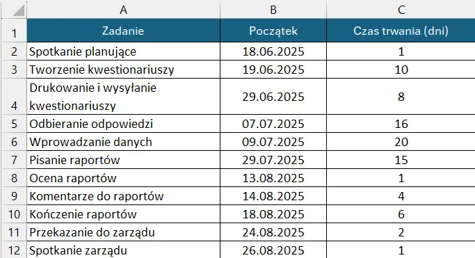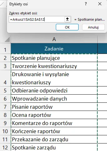 Zaznaczamy nazwy zadań w kolumnie A: