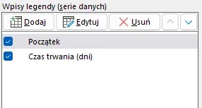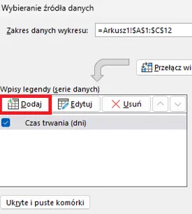 Druga korekta to dodanie dodatkowej serii danych. Aby to zrobić, klikamy Dodaj Wpisy legendy (serie danych):