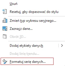Następnie ukrywamy „Czerwoną” serię danych. Klikamy na jednym ze słupków przyciskiem prawym i wybieramy Formatuj serię danych: