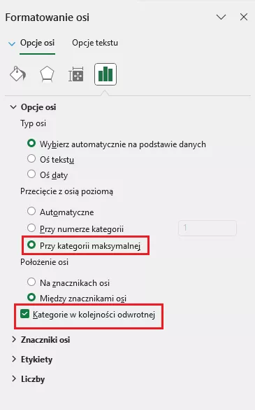 W panelu, który pojawi się po prawej stronie, zaznaczamy Kategorie w kolejności odwrotnej oraz Przy kategorii maksymalnej: