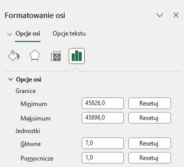 Włączamy formatowanie osi X, minimum i maksimum zmieniamy, wpisując przygotowane daty (liczbowo) oraz zmieniamy jednostkę główną na 7 i jednostkę pomocniczą na 1.