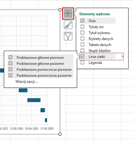 Pozostaje nam na wykresie dodać jednostki główne (7 dni) oraz jednostki pomocnicze (1 dzień). Aby to zrobić, musimy zaznaczyć wykres, w lewym lub prawym górnym rogu pojawi się przycisk Plus, a w nim wskazujemy Linie siatki i zaznaczamy podstawowe i pomocnicze linie: