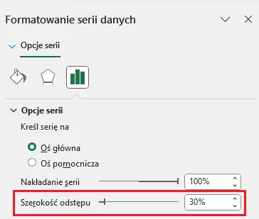 Jeśli powiększymy wysokość słupków, zmniejszając odstęp pomiędzy nimi, da nam to lepszy efekt wizualny. Przyciskiem prawym klikamy na słupku, wybieramy Formatuj serie danych, a następnie zmniejszamy Szerokość odstępu: