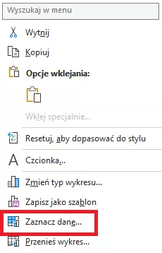 Musimy zmienić etykiety danych na opisy znajdujące się w kolumnie A. Na wykresie klikamy prawym przyciskiem myszy i wybieramy Zaznacz dane: