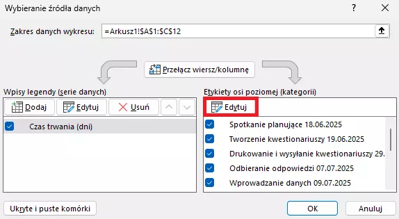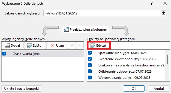 Klikamy polecenie Edytuj Etykiety osi poziomej (kategorii):