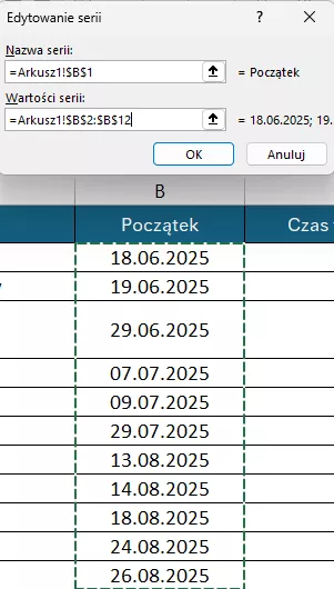 Nazwa serii to zawartość komórki B1, a wartości serii to wszystkie daty rozpoczęcia poszczególnych etapów: