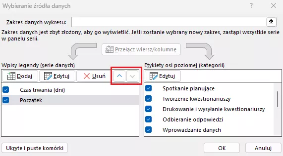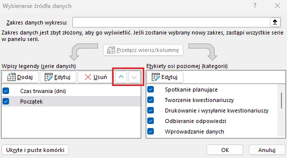 Zamieniamy miejscami przygotowane serie danych klikając odpowiednią strzałkę obok przycisku Usuń: